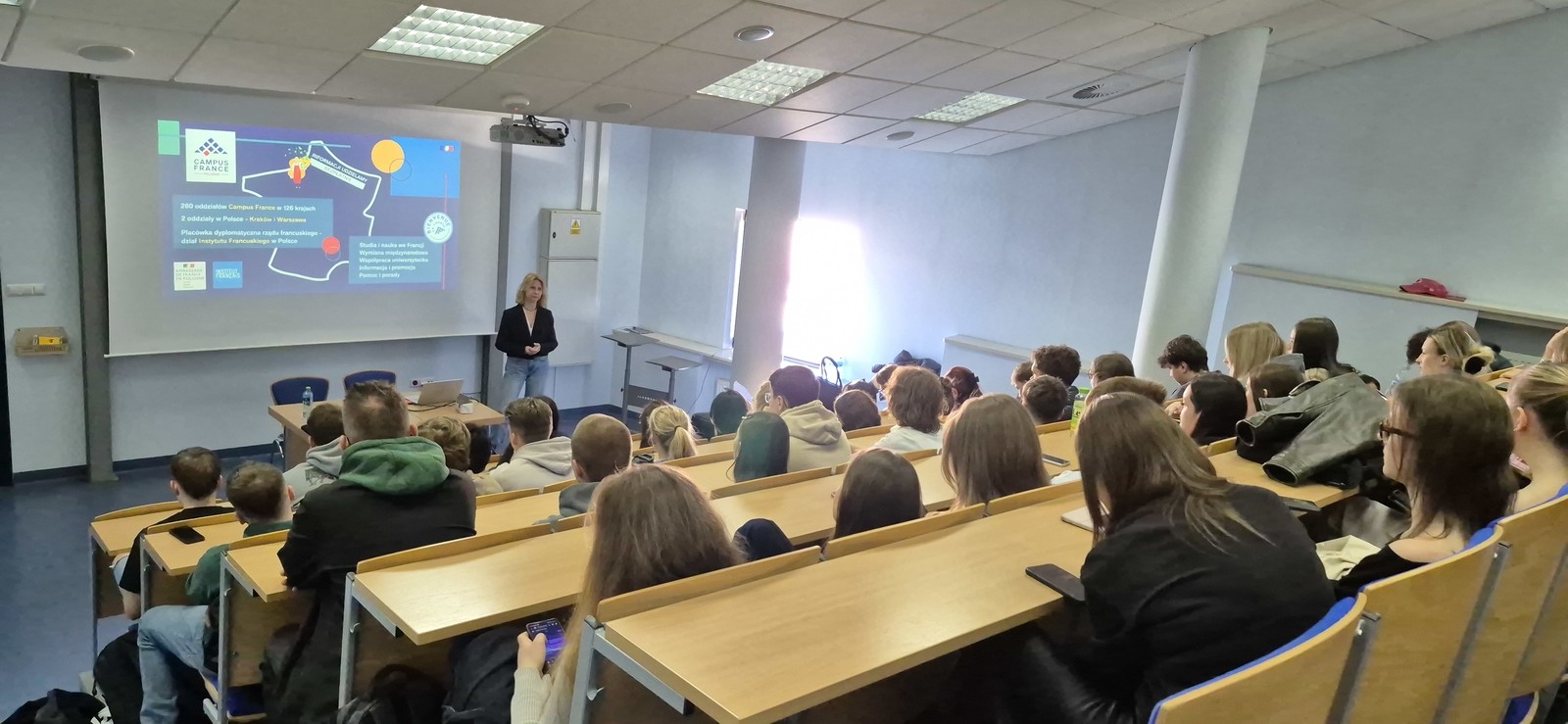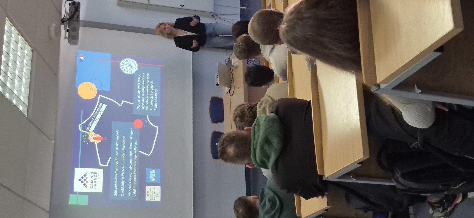 W dniu 11.03.2026 r. studenci Politechniki Rzeszowskiej uczestniczyli w spotkaniu informacyjnym z Panią Iwoną Gorczycą-Polus, koordynatorką oddziału Campus France Polska w Krakowie, instytucji wspierającej kandydatów zainteresowanych studiami we Francji. W trakcie spotkania studenci mogli poznać szerokie możliwości, jakie oferują francuskie uczelnie, ze zwróceniem uwagi na różnorodność programów studiów od inżynierskich i technicznych po humanistyczne i artystyczne, wysoką jakość kształcenia oraz międzynarodowy charakter francuskich kampusów, dostępne programy w języku angielskim, zasady rekrutacji poprzez platformę Études en France, możliwości finansowania studiów, w tym stypendia rządu francuskiego i programy regionalne.