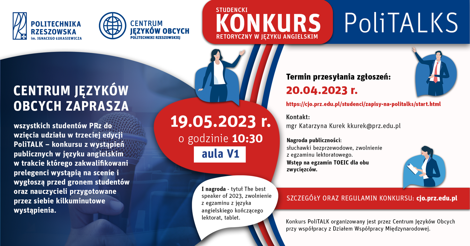 Konkurs PoliTALK organizowany przez Centrum Języków Obcych przy współpracy z Działem Współpracy Międzynarodowej odbędzie się 19.05.2023 o godzinie 10:30 w auli V1. Konkurs skierowany jest do studentów Politechniki Rzeszowskiej, którzy zgłoszą chęć uczestnictwa poprzez wypełnienie formularza zgłoszeniowego w terminie do 20.04.2023. W trakcie wydarzenia ocenione zostaną prezentacje uczestników, a autor najwyżej ocenionego wystąpienia otrzyma zwolnienie z egzaminu lektoratowego, tytuł The Best Speaker of 2023 oraz cenne nagrody rzeczowe. Dodatkowo przewidziana została również nagroda publiczności, zaproszenia na egzamin TOEIC dla obu zwycięzców oraz nagrody rzeczowe dla wszystkich prelegentów biorących udział w konkursie.