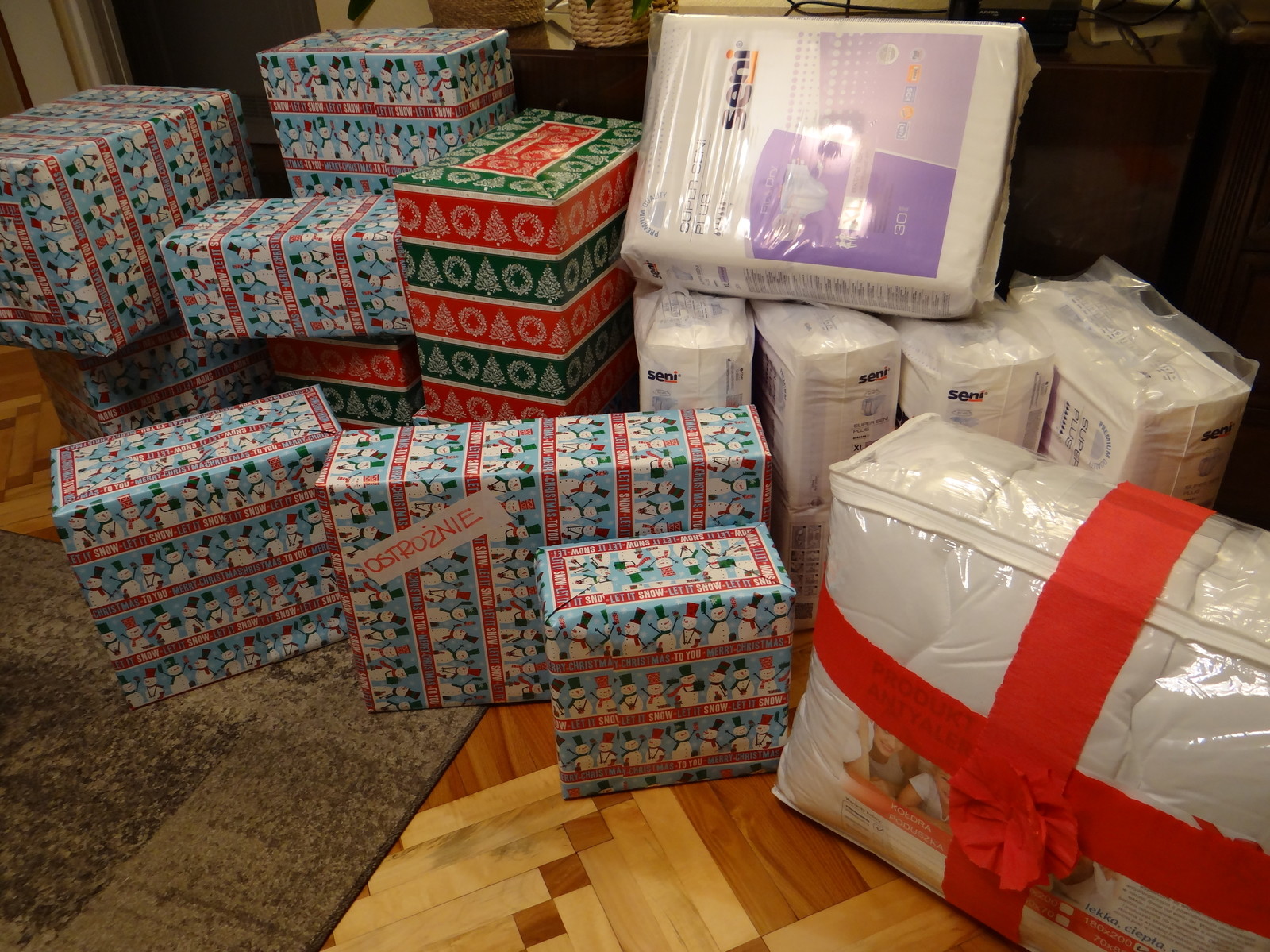 W paczce pani Katarzyny znalazł się grzejnik elektryczny, który pozwoli jej ogrzać zimną łazienkę, zapas żywności, który wystarczy na kilka dobrych miesięcy i pomoże zaoszczędzić pieniądze na potrzebne leki, środki pielęgnacyjne, opatrunki, bandaże, pampersy, środki czystości, ciepła odzież na zimę, kołdra, pościel, ręczniki, czajnik elektryczny, który bezpiecznie sam się wyłączy po zagotowaniu wody (dla osoby, która ledwo się porusza o dwóch kulach jest to duże ułatwienie). Pani Katarzyna zapytana o jakim upominku świątecznym marzy odpowiedziała, że o mikserze, którego nigdy nie miała i zawsze wszystko robiła ręcznie, a teraz obolałe i powykrzywiane reumatyzmem ręce już jej na to niestety nie pozwalają. Możecie sobie wyobrazić jak zaświeciły się jej oczy gdy znalazła mikser w swojej paczce.